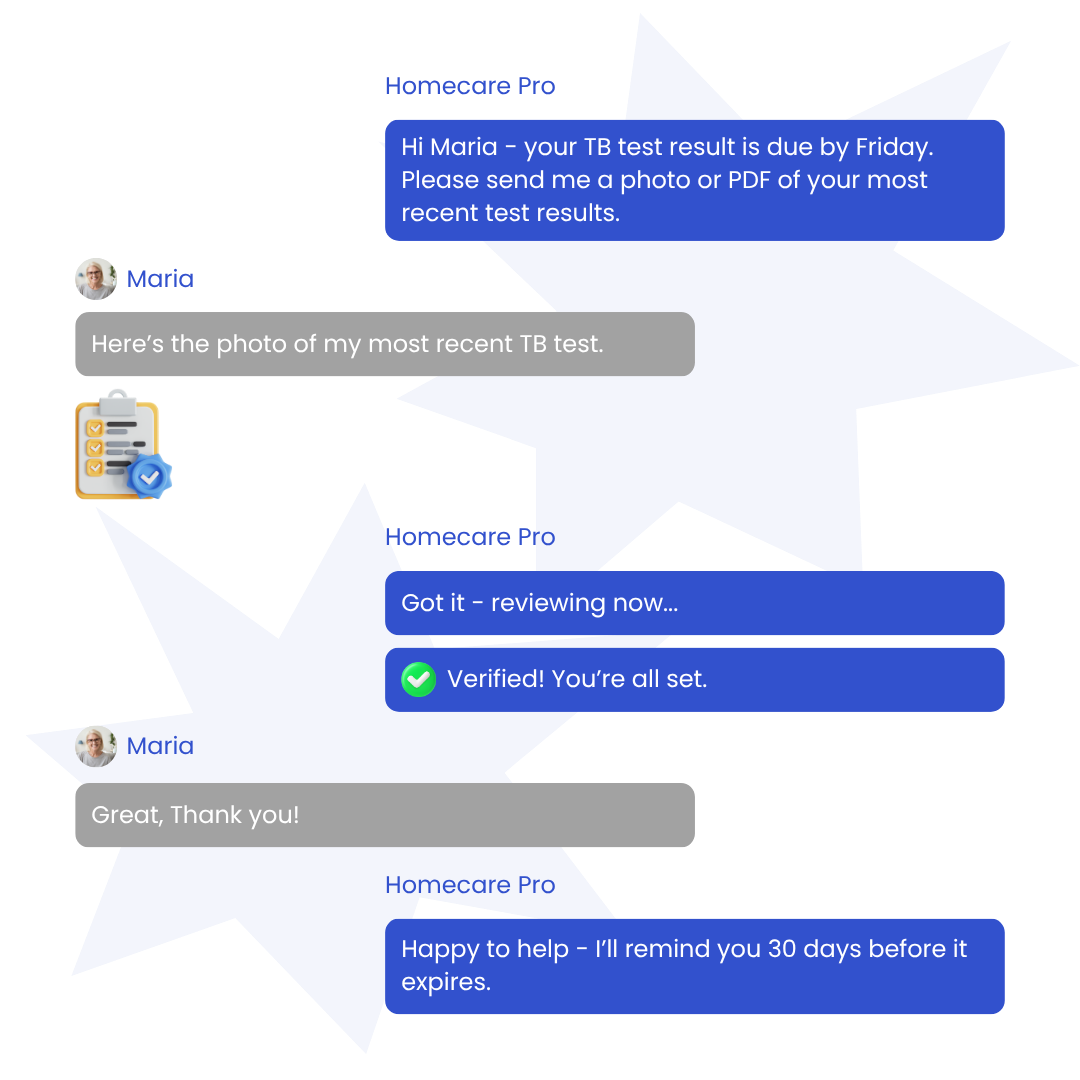 Over 100,000 automated conversations each month guide caregivers through onboarding and compliance. SMS reminders and context-aware notifications ensure every task gets done on time.